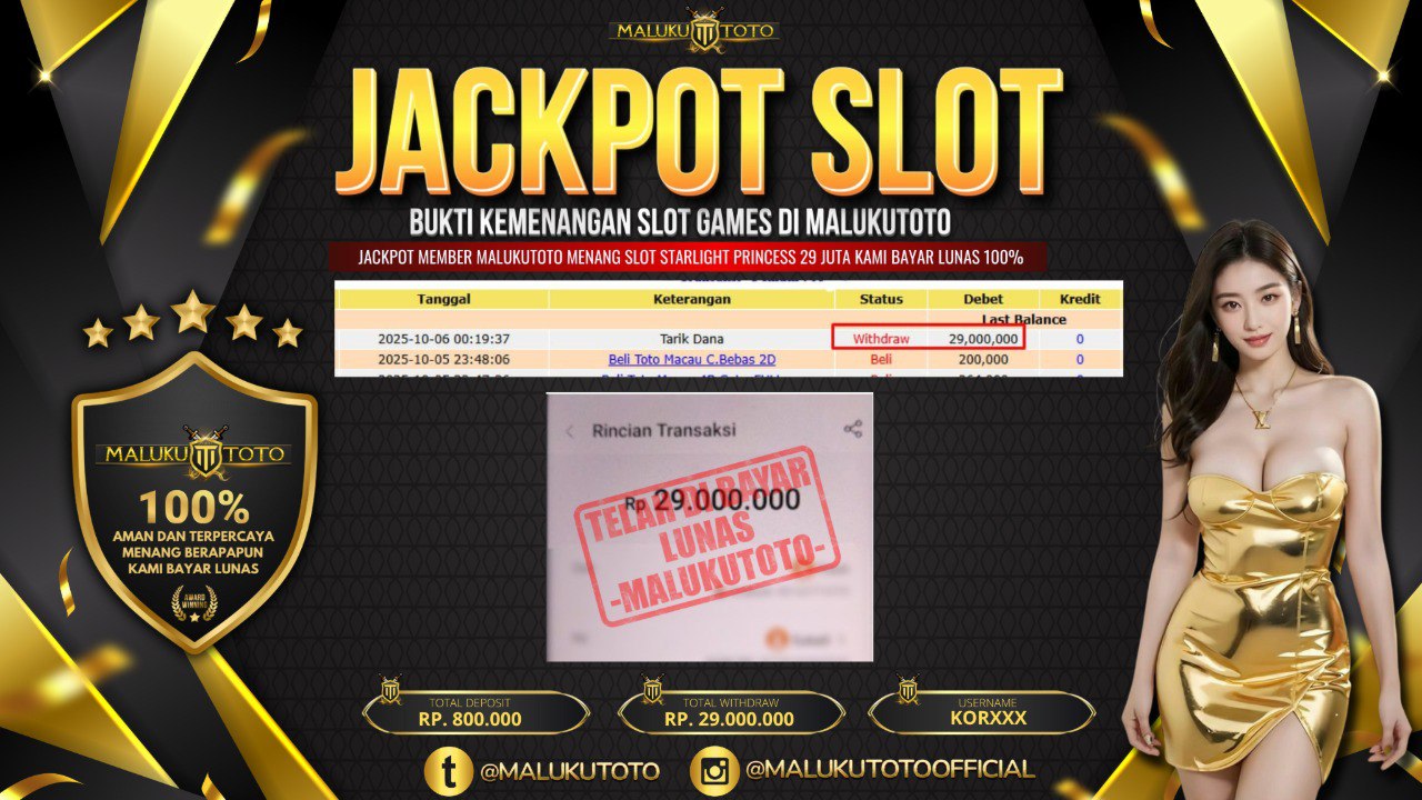 Selamat kepada User id : KOR*** Telah berhasil mendapatkan kemenangan besar pada permainan SLOT STARLIGHT PRINCESS kemenangan Sebesar Rp.29,000,000, Setelah mengisi formulir withdraw dengan kurung waktu hanya 3 – 5 menit pihak malukutoto sudah melakukan transfer kepada pemilik Userid dan dana sudah dapat di cairkan oleh pemenang. Bukti pembayaran yang kami berikan merupakan bukti pembayaran yang SAH / VALID yang langung di dapatkan melaui tanda transfer transaksi dari Bank yang di tuju.