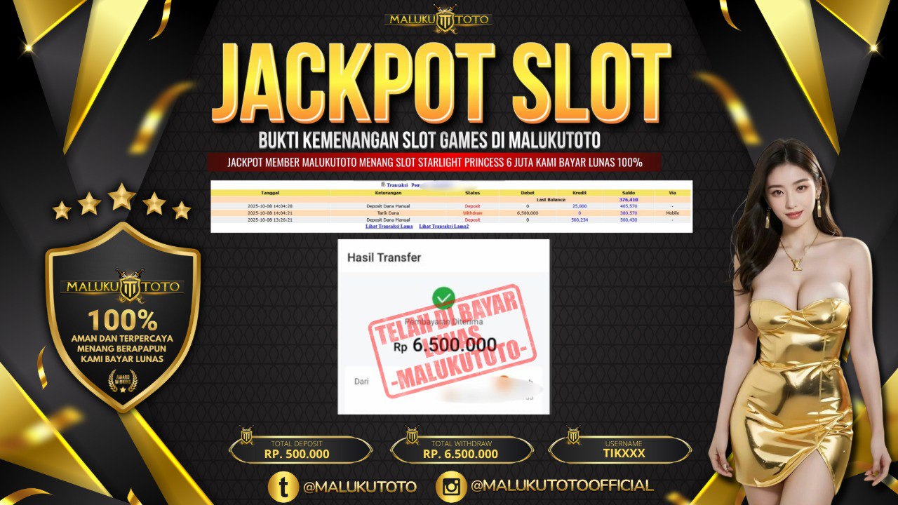 Selamat kepada User id : TIK*** Telah berhasil mendapatkan kemenangan besar pada permainan SLOT STARLIGHT PRINCESS kemenangan Sebesar Rp.6,500,000, Setelah mengisi formulir withdraw dengan kurung waktu hanya 3 – 5 menit pihak malukutoto sudah melakukan transfer kepada pemilik Userid dan dana sudah dapat di cairkan oleh pemenang. Bukti pembayaran yang kami berikan merupakan bukti pembayaran yang SAH / VALID yang langung di dapatkan melaui tanda transfer transaksi dari Bank yang di tuju.